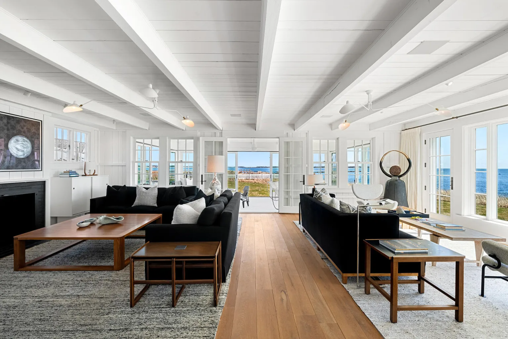 Renovated in partnership with architect Dell Mitchell and designer Heather Wells, the 8-bedroom estate now features whitewashed plank walls, vaulted beamed ceilings, and floor-to-ceiling windows that fill each room with light and salt-air breezes.