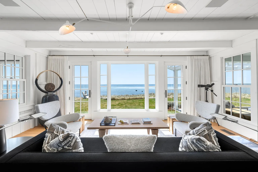 Moving past the staircase and through the central hall, the home opens up dramatically into the main living area, an expansive, light-filled space with uninterrupted views of the Atlantic.