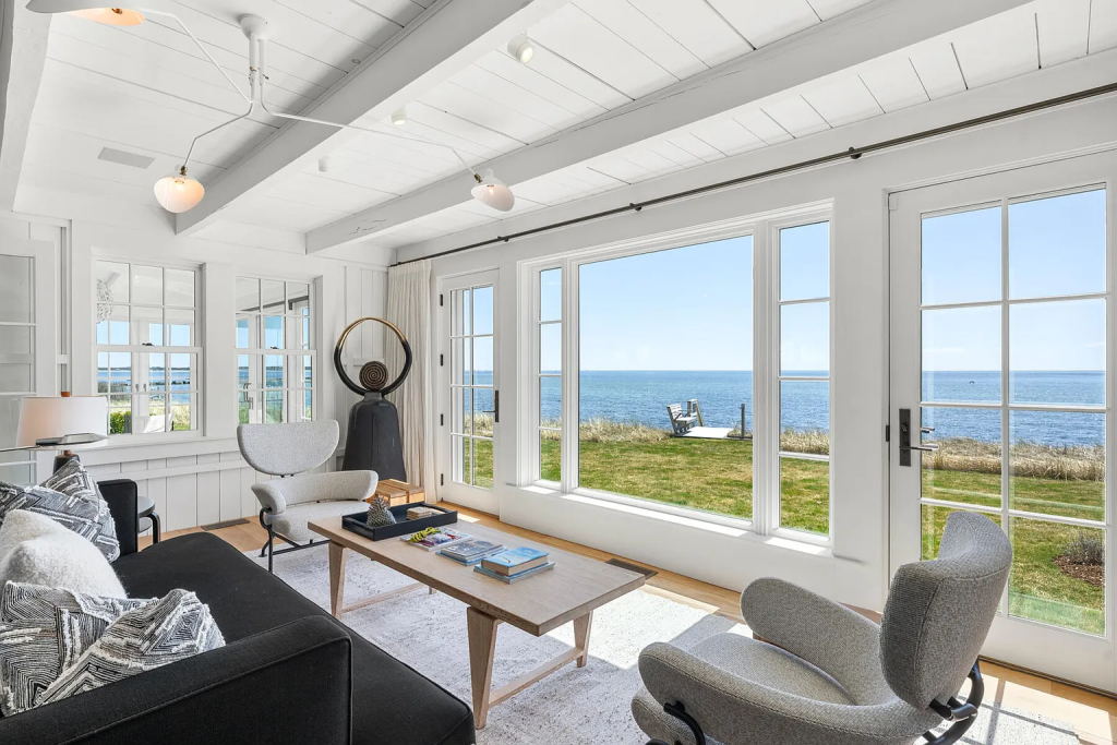 Exposed ceiling beams and white wood paneling carry through from the foyer, but here, the scale widens. Floor-to-ceiling windows and French doors line the ocean-facing wall, framing panoramic scenes of the coastline and flooding the space with natural light.