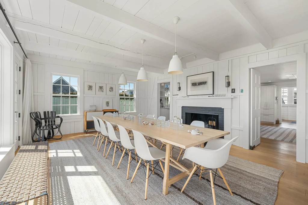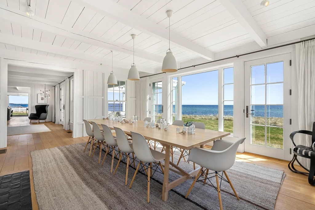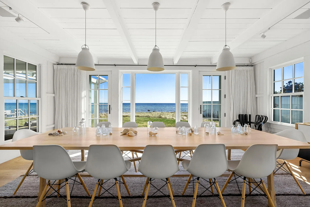 A long natural wood table anchors the space, flanked by twelve molded chairs and lit by a trio of simple pendant lights that hang from the white-beamed ceiling. The look is coastal minimalism at its most precise, every element stripped down to light, form, and function.