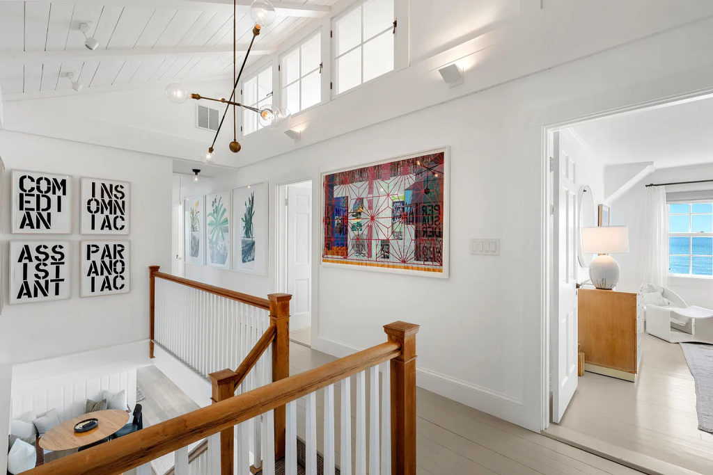Upstairs, the hallway sets the tone with curated artwork and clerestory windows that lend an architectural flair to the transition into the primary suite.