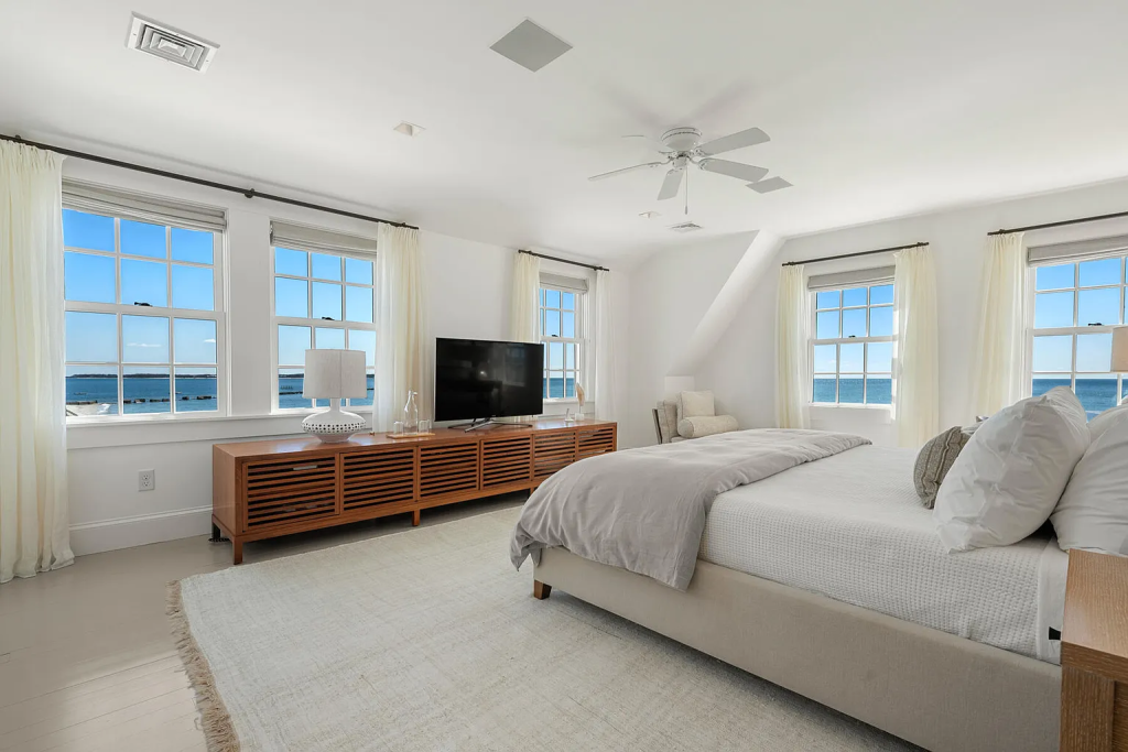 Inside, the spacious bedroom is surrounded by five oversized windows that frame unobstructed views of the water, flooding the space with natural light throughout the day.