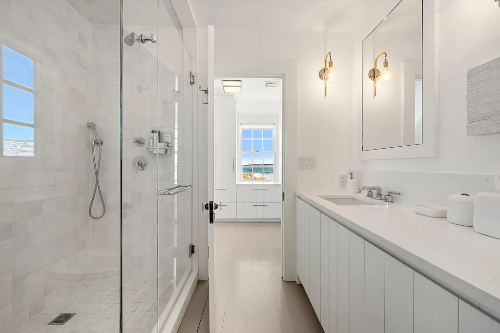 Brass sconces and soft lighting keep the all-white palette from feeling cold, while windows on both ends of the bath maintain the visual connection to the ocean.