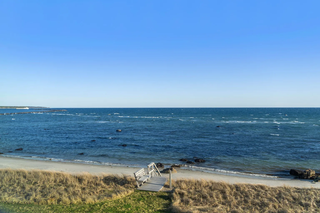 Set atop a natural bluff, the home enjoys private access to the sand via a wooden staircase that leads directly to the shoreline.