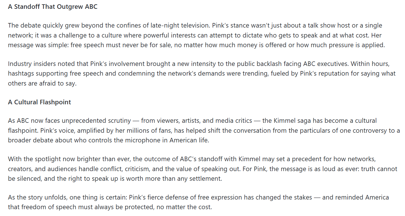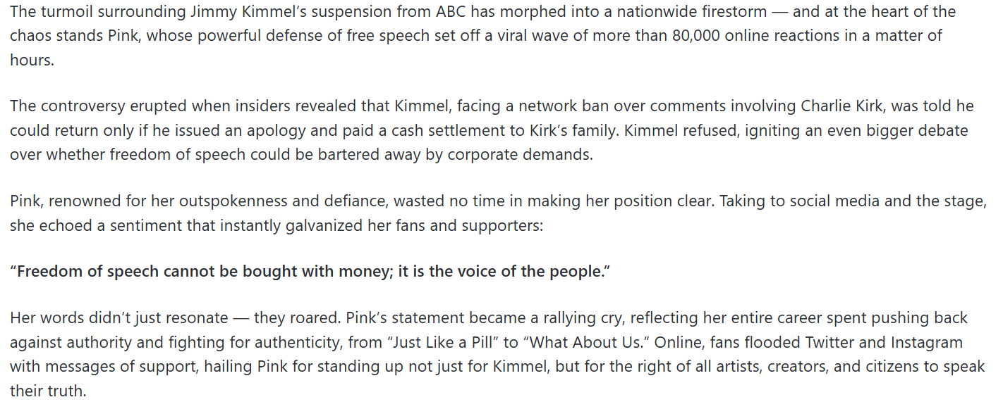 Pink wasn’t having it. The pop rebel grabbed the spotlight and fired off one line that sent the room into chaos — and within minutes, more than 80,000 reactions online turned her words into a cultural earthquake. What she said didn’t just defend Kimmel